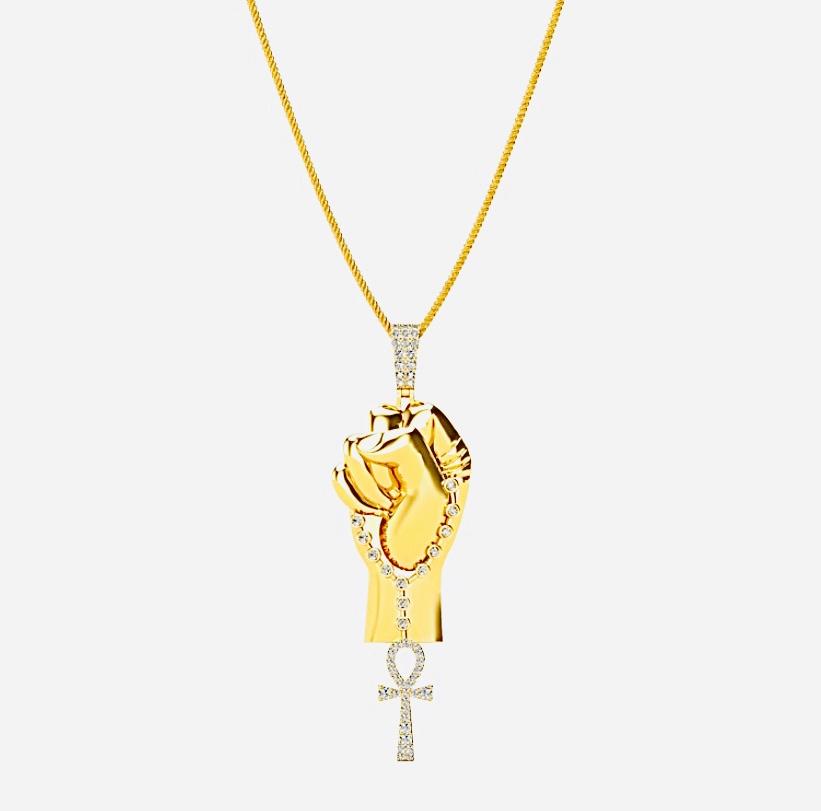 Die Faust erscheint 3D, ist aber tatsächlich flach, um eine benutzerdefinierte Gravur auf der Rückseite des Anhängers zu ermöglichen.
