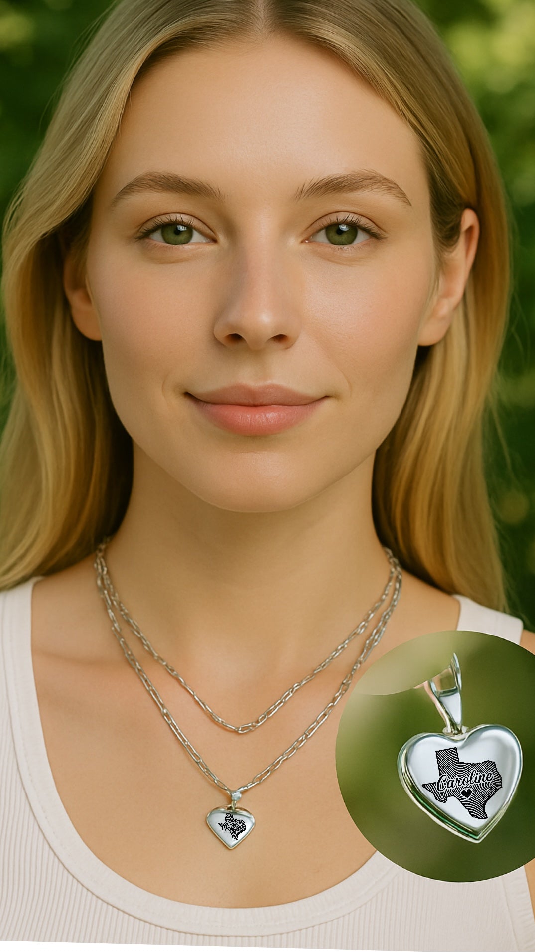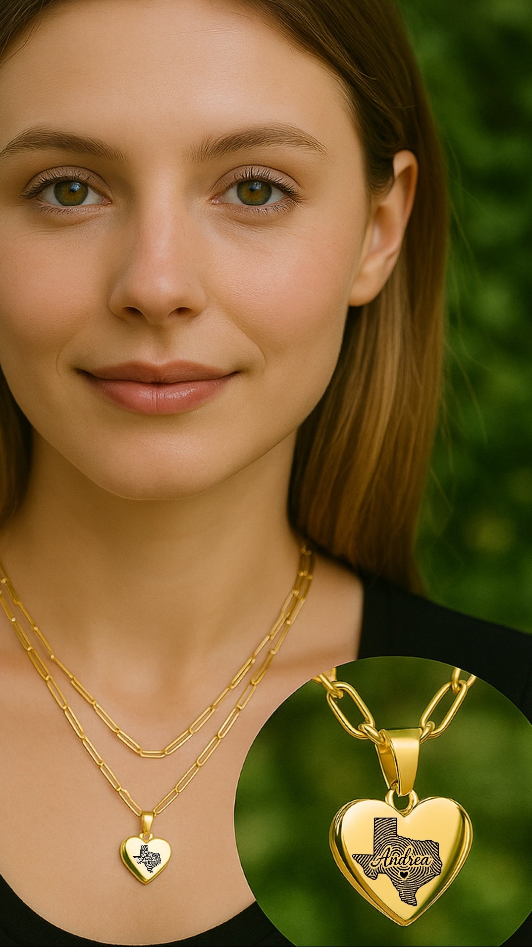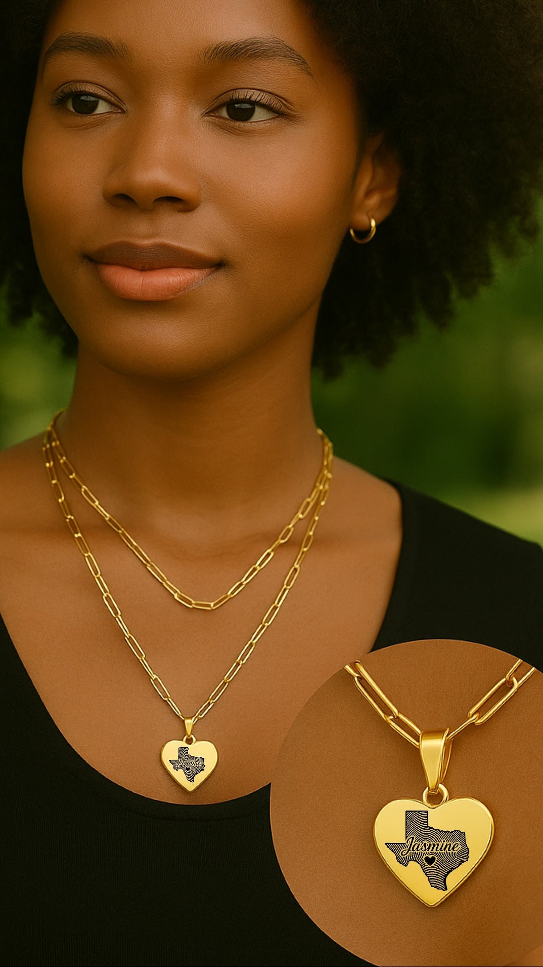Este elegante conjunto de collar presenta el mapa de huellas digitales de Texas con su nombre dentro grabado en un lado y su inicial en el otro lado que combina el patrimonio con encanto personalizado, es una pieza significativa perfecta para el uso o los regalos diarios.