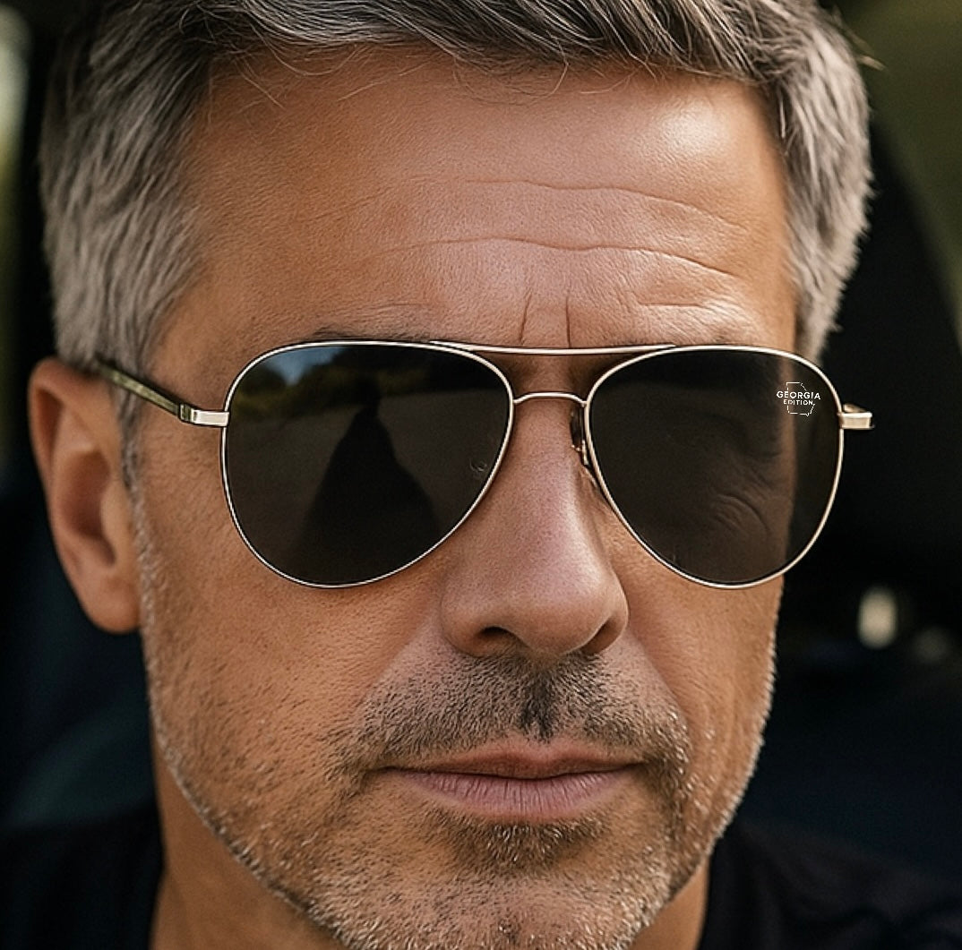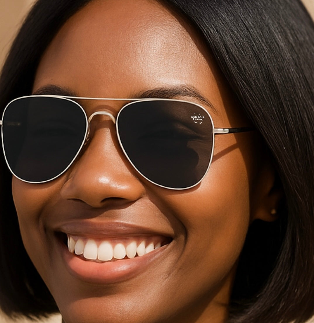 Sunglasses is characterized by a an acetate and metal frame with aviator lenses. The left lens decorated with the Exclusive Georgia Edition map logo. Represent your home state in style like never before