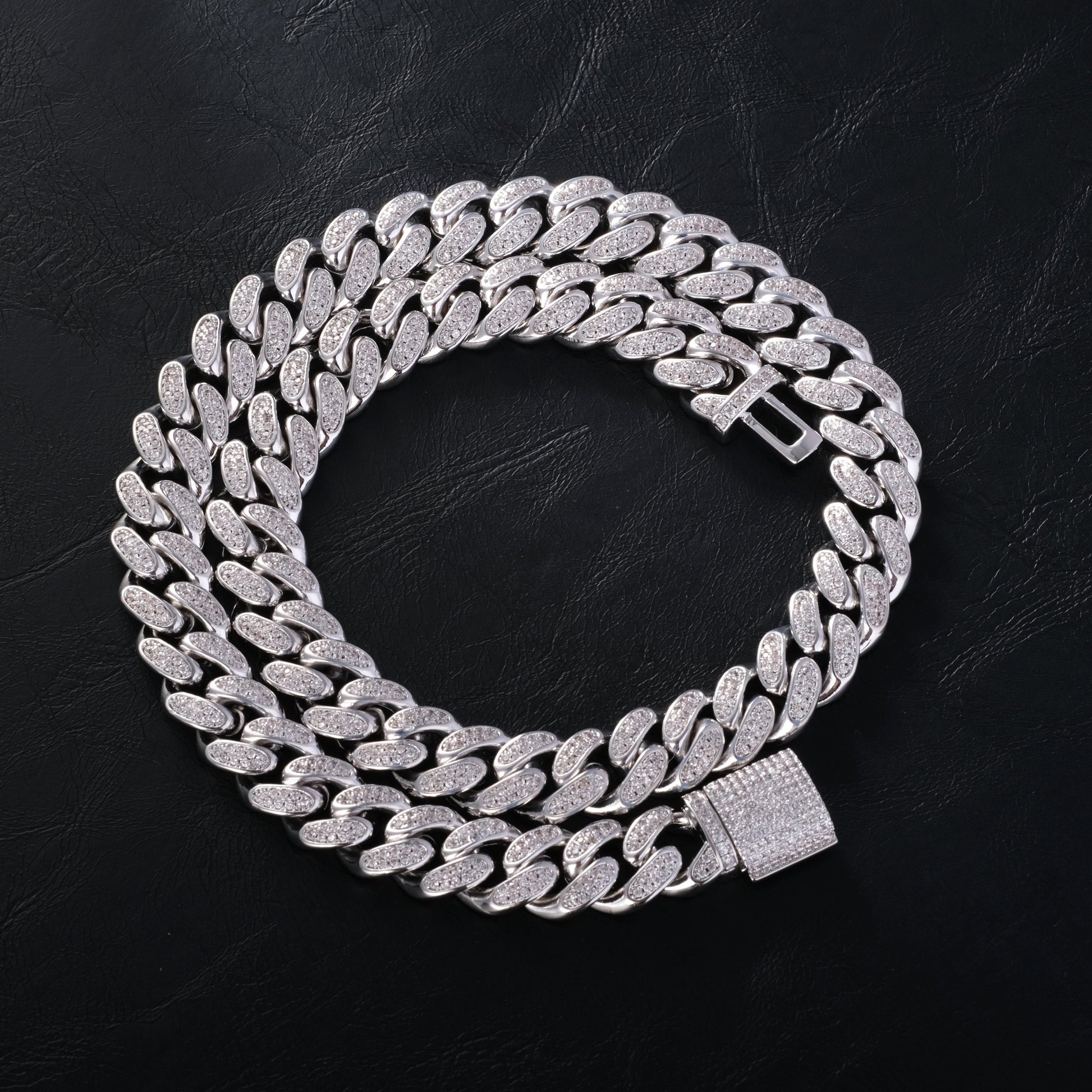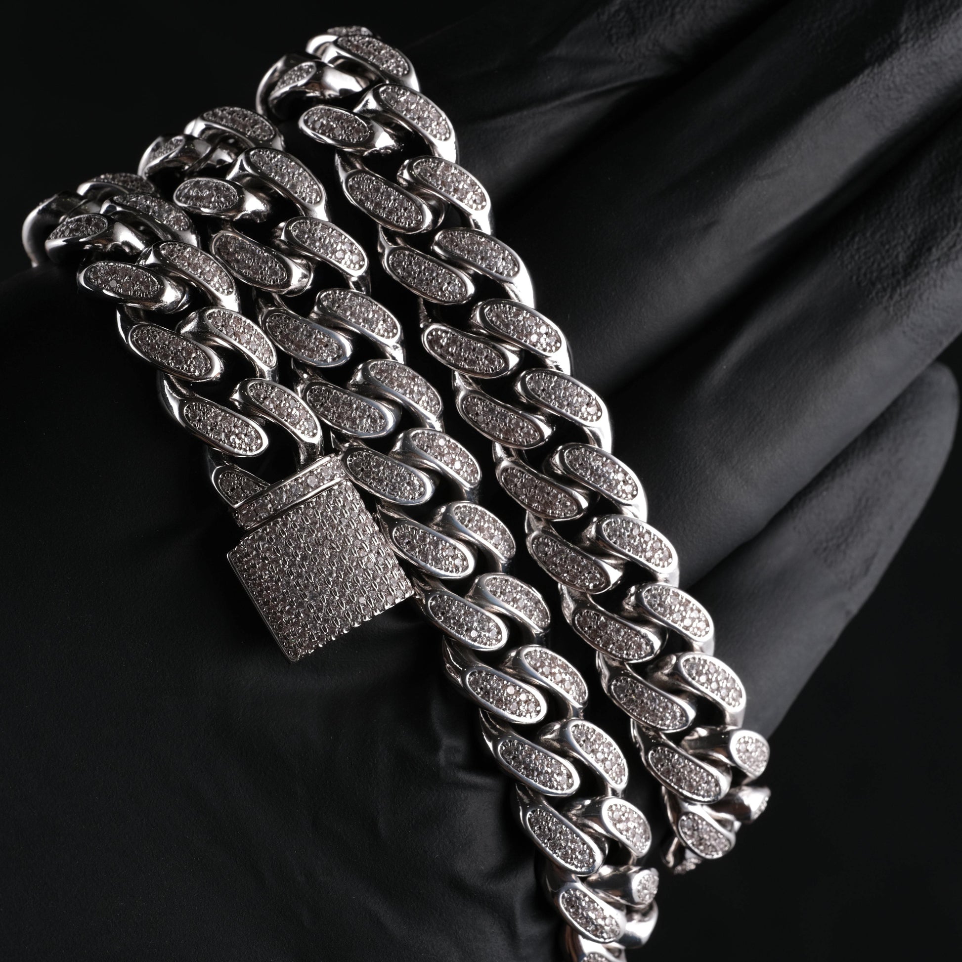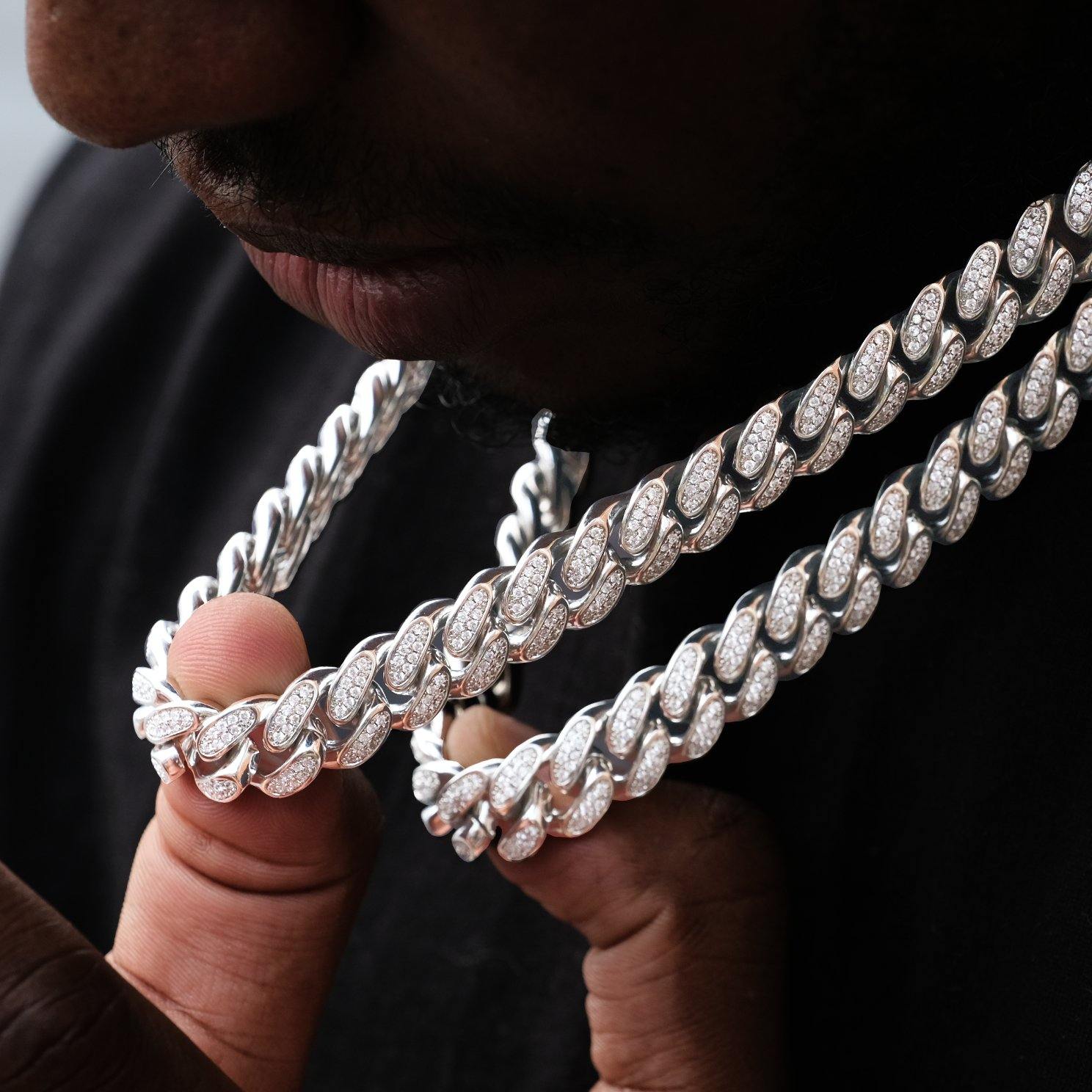 The 12mm Iced Miami Cuban Chain provides a more subtle approach to the bigger, iced chain. The Miami Cuban Chain features a rounder, thicker style and is available in 14K Gold and white gold.features iced out the clasp and are handcrafted to perfection.