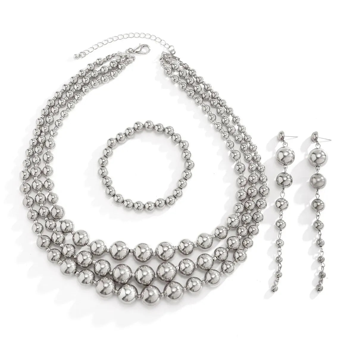 - Style: The set features a triple-layer beaded design, with beads that taper in size—smaller at the back and gradually becoming larger towards the front. The earrings follow a similar pattern, with a cascading dangle from big to small, creating a dynamic and elegant look. The bracelet complements the set with a simple beaded design, bringing balance to the bold pieces.