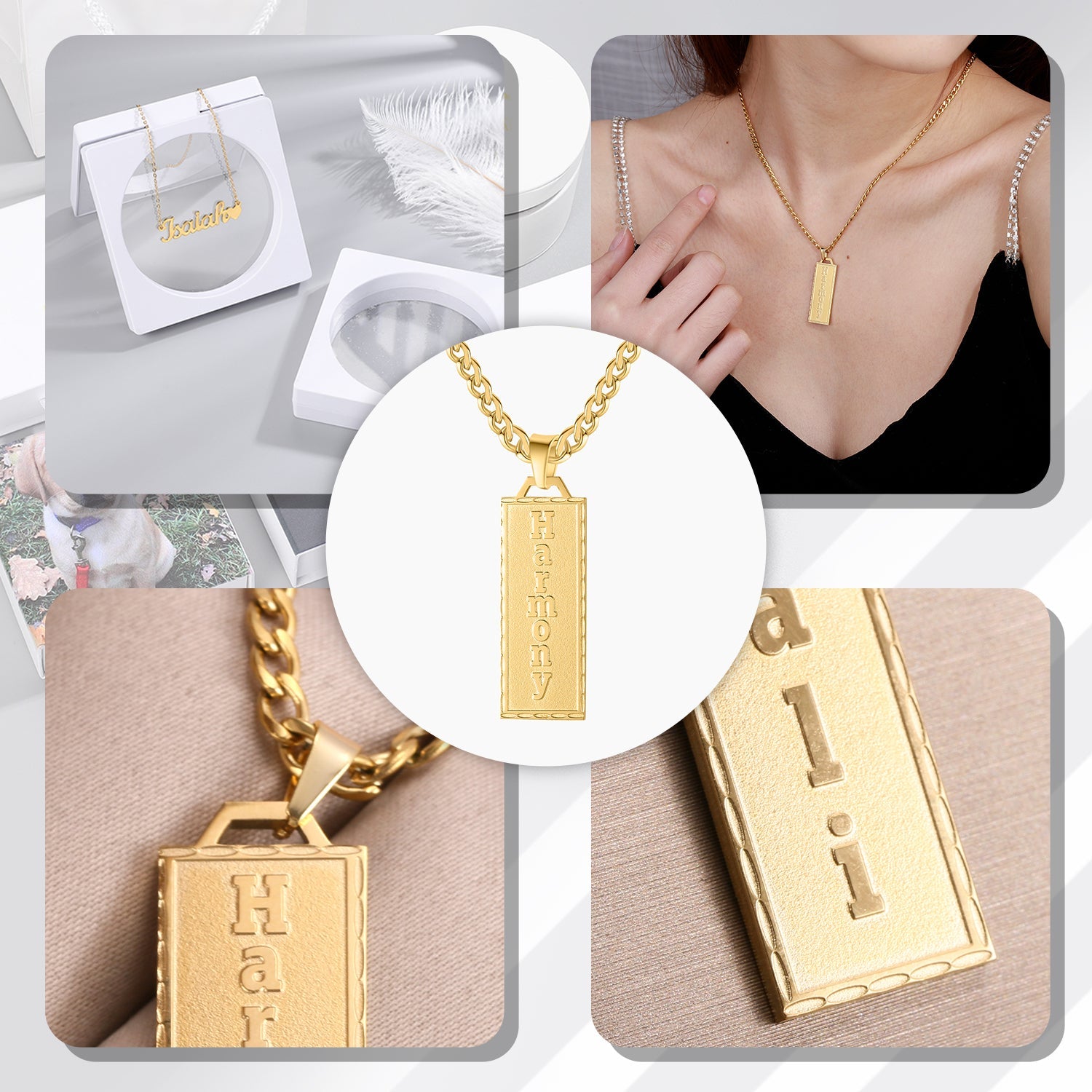 Introducing our Embossed Name Bar Pendant Necklace, a personalized and timeless accessory. This elegant bar pendant features a custom embossed name or word, making it the perfect keepsake or gift. Crafted from Gold plated stainless steel, this piece blends simplicity and sophistication, ideal for daily wear or special occasions. Personalize your style with a touch of meaning!