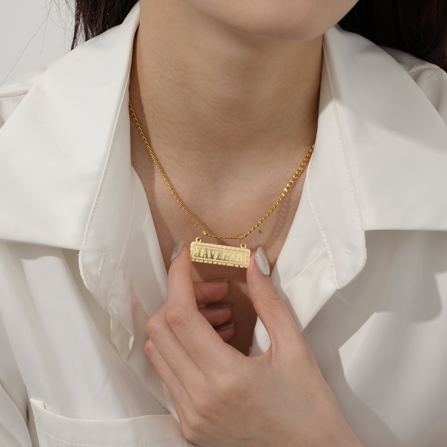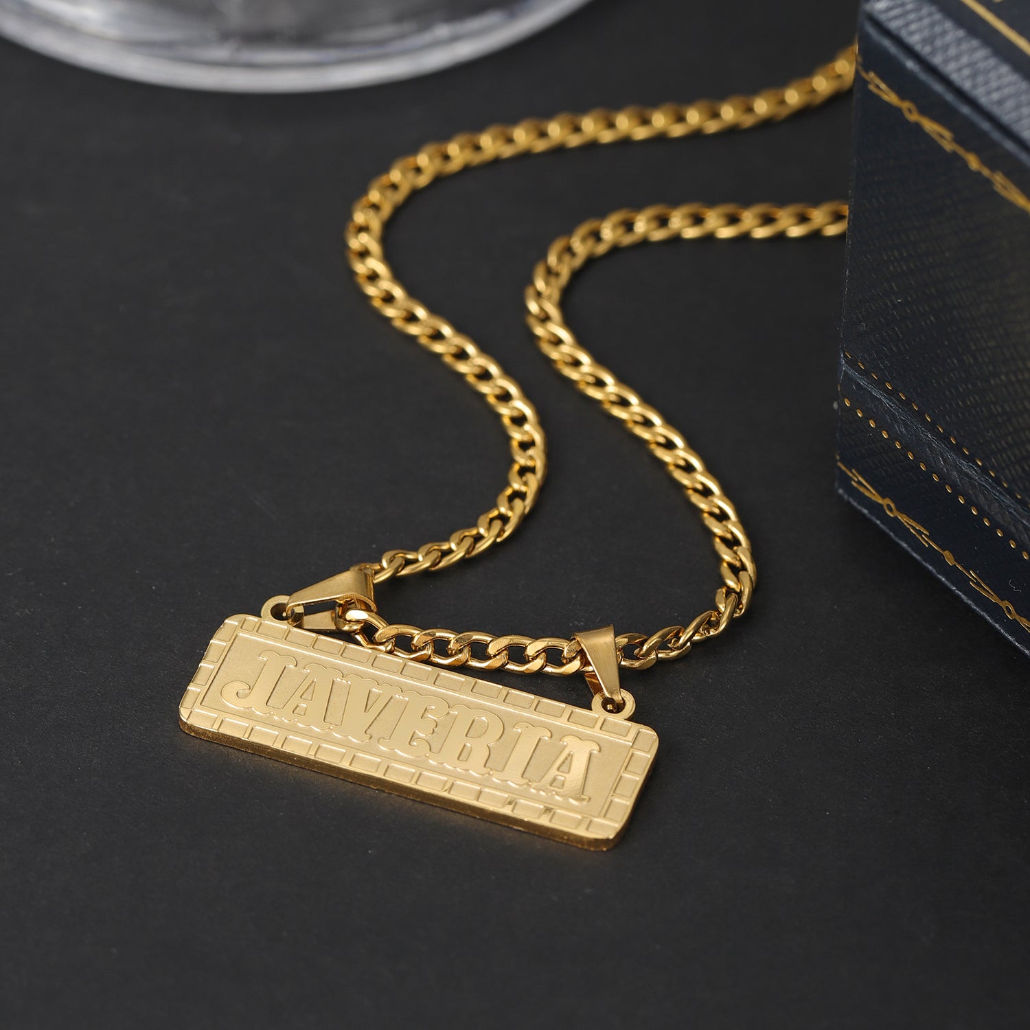 Make a statement with our new Embossed Nameplate with cuban chain with your name, the name of a loved one, or a special word. Crafted from 18K gold and silver plating, this piece is made to last.