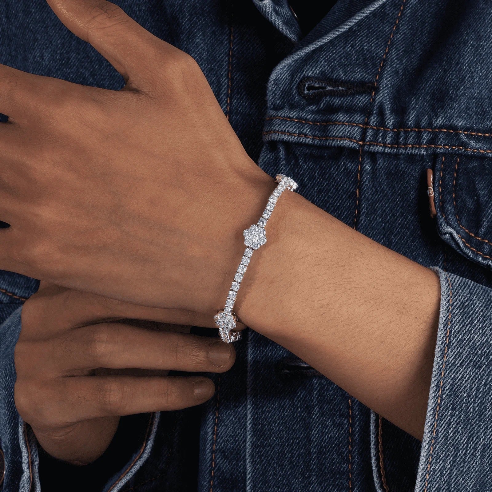 The Moissanite Iced Flowers Bracelet is flooded with Moissanite stones throughout and shine from all angles. They will test positive as diamonds on most handheld diamond testers. The perfect alternative to large diamonds that cost thousands.